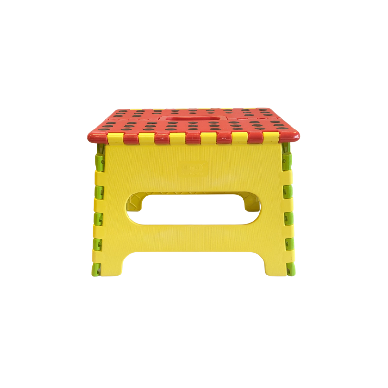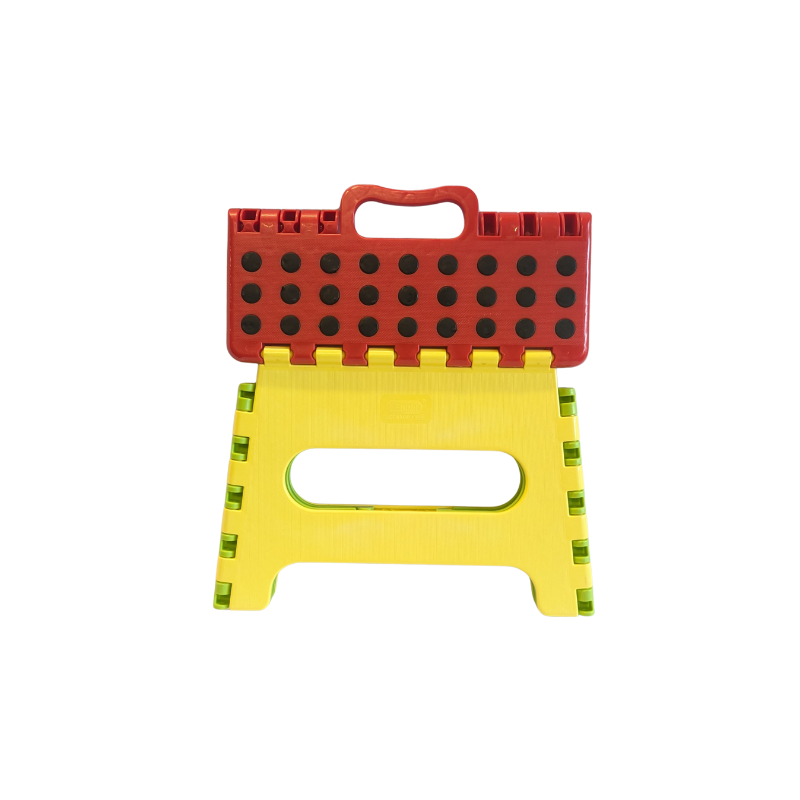 This foldable plastic step stool is a versatile and sturdy household essential, perfect for both kids and adults. Designed in bright red and yellow colors, it combines safety, portability, and durability for everyday use.