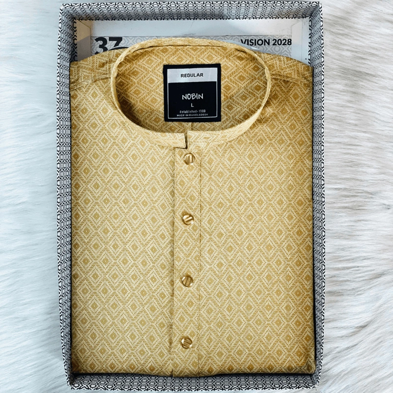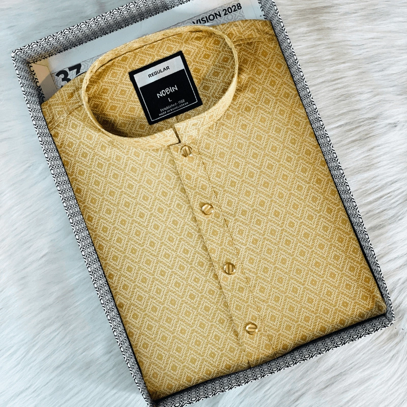 The NOBIN Regular Fit Printed Panjabi for Men features a vibrant golden yellow base with a geometric pattern in white. The unique design brings a touch of modern elegance to traditional wear. Its refined appearance is perfect for those seeking both style and comfort for casual or semi-formal events.