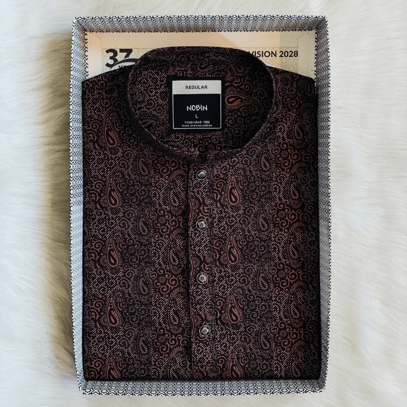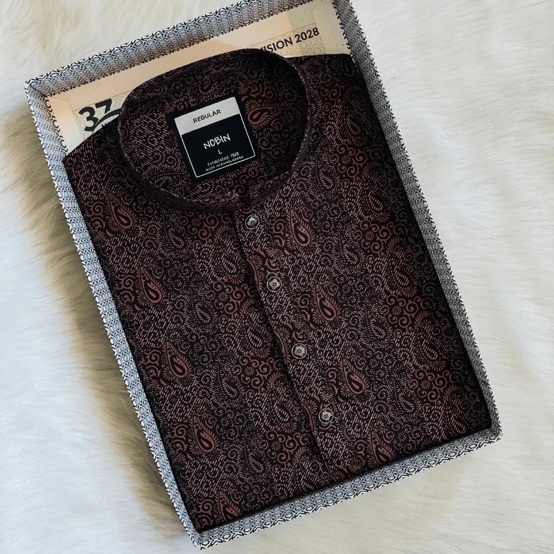 The Men’s NOBIN Maroon & Black Micro-Paisley Print Panjabi embodies classic sophistication. Designed for men who appreciate both tradition and modern flair, this Panjabi features an intricately detailed paisley and scrollwork print that exudes elegance.
