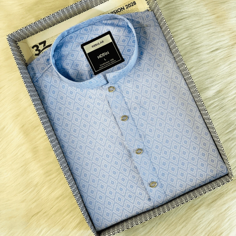 A refined regular-fit Panjabi designed for everyday elegance. The band collar and half placket offer a clean, contemporary look, while the light sky blue tone keeps the ensemble understated yet polished. The cut provides ease of movement and a neat drape that complements most body types.